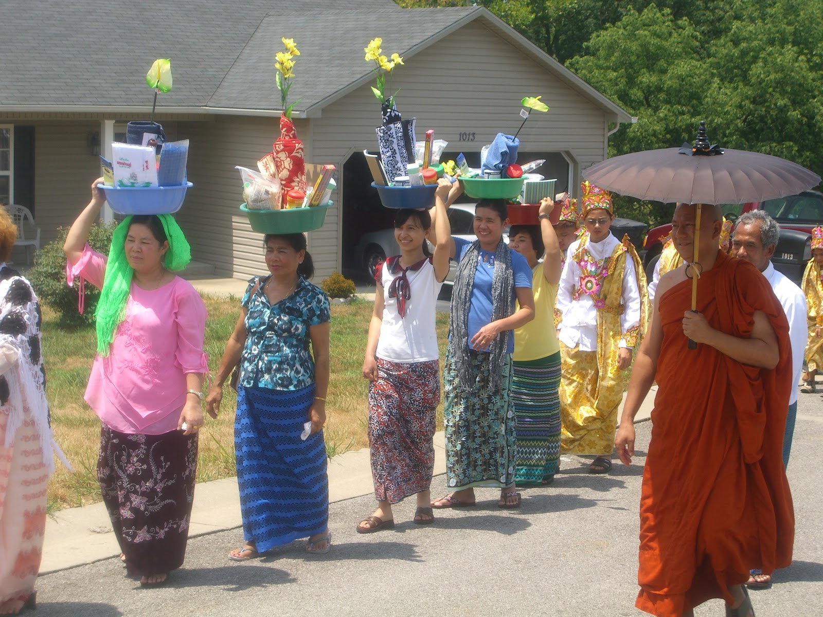 ေန႔လည္ (၁) နာရီအခ်ိန္မွာ အလွဴဒါယကာ ဒါယိကာမမ်ားစုေပါင္း၍ ေက်ာင္းတုိက္ကုိ (၃)ႀကိမ္ သပိတ္၊သကၤန္း၊ ဖိနပ္၊ထီး၊ လွဴဖြယ္ပစၥည္း ကန္ေတာ့ပြဲမ်ားကုိ ကုိယ္စီကုိယ္စီ ေခါင္းေပၚရြက္ရွင္ေလာင္းလွည့္လည္ပါတယ္၊၊