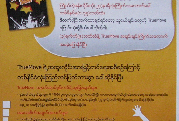 ျမန္မာျပည္သားတုိ႔ကုိ ပစ္မွတ္ထားေသာ True Move ဆင္မ္ကတ္ ေၾကာ္ျငာသည္လည္း ျမန္မာဘာသာျဖင့္ပင္ ေရးသားထားကုိ ေတြ႔ရသည္။ True Move ကုမၼဏီတြင္ ျမန္မာ၀န္ထမ္းကုိ ခန္႔ထားသျဖင့္ ျမန္မာဘာသာျဖင့္ ဆက္သြယ္ စုံစမ္း ေမးျမန္းနုိင္သည္ဟု ေၾကာ္ျငာက ဆုိသည္။