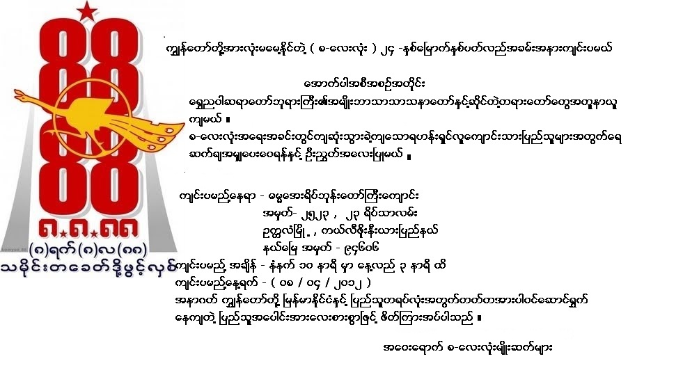 လာမယ့္စေန ၾသဂုုတ္လ ၄ ရက္၊ ဥကၠလံျမိဳ႔ ဓမၼဧရိပ္ေက်ာင္းတိုုက္မွာ က်င္းပမည္ျဖစ္ေၾကာင္း ဖိတ္စာပိုု႔ထားပါတယ္။
