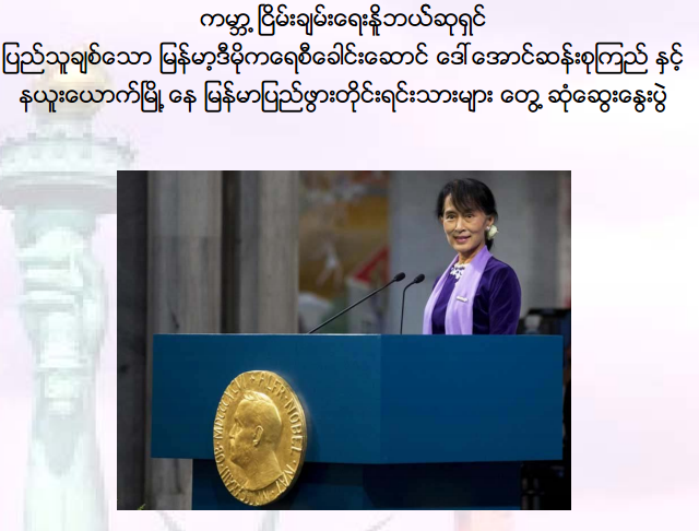 လာမယ့္ စက္တင္ဘာ တတိယပတ္မွာ အေမရိကန္ျပည္ေထာင္စုုကိုု လာေရာက္လည္ပတ္ျပီး ဂုုဏ္ျပဳခ်ီးျမွင့္မႈမ်ား လက္ခံရန္ လာေရာက္မယ့္ ျမန္မာ့ဒီမိုုကေရစီေခါင္းေဆာင္၊ ျပည္သူ႔လႊတ္ေတာ္ကိုုယ္စားလွယ္၊ ေဒၚေအာင္ဆန္းစုုၾကည္ကိုု အေမရိကန္ေရာက္ ျမန္မာတိုုင္းရင္းသားကြန္ျမဴနီတီမ်ားကလည္း ညီညာဖ်ဖ် လႈိက္လဲွစြာၾကိဳဆိုုရန္ ေစာင့္ေမွ်ာ္လ်က္ရွိပါတယ္။