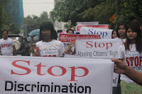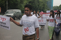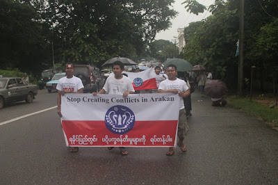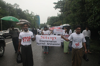 ဇြန္လဆန္းမွ စတင္၍ ရခိုင္ျပည္နယ္တြင္ ျဖစ္ပြားခဲ့သည့္ အၾကမ္းဖက္မႈမ်ား၊ မၿငိမ္မသက္မႈမ်ားႏွင့္ပတ္သက္၍ ႏိုင္ငံတကာ အန္ဂ်ီအိုမ်ား လူ႔အခြင့္အေရး အဖြဲ႕အစည္းမ်ားက ရခိုင္ျပည္သူမ်ား အေပၚ ခြဲျခားဆက္ဆံျခင္း မျပဳေစရန္ ရခိုင္အမ်ိဳးသား ကြန္ရက္ဟု ေခၚဆိုသည့္ အဖြဲ႕မွ ယေန႔နံနက္ပိုင္းက ရန္ကုန္ၿမိဳ႕တြင္ ၿငိမ္းခ်မ္းစြာ ဆႏၵထုတ္ေဖၚခဲ့ၾကသည္။