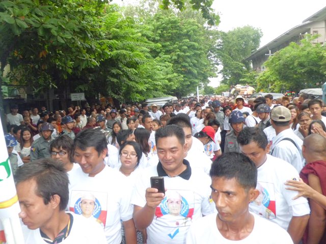 လမ္းတစ္ေလွ်ာက္မွာေတာ့ “ႏုိင္ငံေတာ္သမၼတႀကီး ဦးသိန္းစိန္ က်န္းမာပါေစ။ အမိျမန္မာျပည္ကိုကာကြယ္ပါ”သမၼတႀကီးကို ေထာက္ခံတယ္ ဆိုရင္ လက္ခုပ္ၾသဘာေပးၾကပါ” လုိ႔ လက္ကိုင္ဟြန္းတိုေလးနဲ႔တုိင္ေပးၾကၿပီး၊ လက္ေဘးဝဲယာမွ ပရိသတ္ႀကီးက ေမတၱာပုိ႔ၾက၊ လက္ခုပ္တီး ၾက၊ ဟစ္ေအာ္ေႂကြးေၾကာ္အားေပးၾကတာကို ေတြ႕ရပါတယ္။