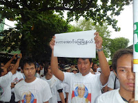 ၃၅ × ၈၄ လမ္းမွ စထြက္ထြက္ခ်င္း ကမာၻမေၾကသီခ်င္းသီဆိုၿပီးထြက္ဖို႔စီစဥ္ေပမယ့္ ၿမိ႕နယ္မွဴးကတားလို္႔ အဆုံးထိမဆိုရဘဲ ရပ္ပစ္လုိက္ၾကရ ပါတယ္။