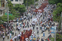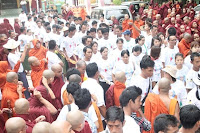သံဃာတစ္ဖဲြ႕၊ လူတစ္ဖဲြ႕၊ သံဃာတစ္ဖဲြ႕ျဖင့္ သံဃာတန္း လူတန္းႀကီးျဖစ္သြားက ေရွ႕ဆုံးတန္းမွ ေနာက္ဆုံးတန္းအထိ အကြာအေဝးမွာ မႏၱ ေလးအေခၚ သုံးျပ (သုံးလမ္း) အျပည့္ျဖစ္ေနတာကို ေတြ႕ရပါတယ္။ သံဃာအင္အားခ်ည္း ငါးေထာင္ေက်ာ္ရွိၿပီး၊ လိုက္ပါအားေပးသူ လူထု မွာ သံဃာထက္ပင္မ်ားျပားေနတာကို ေတြ႕ရပါတယ္။