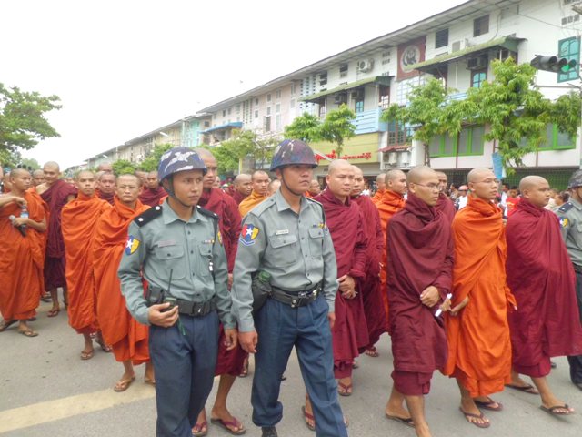 အစပထမတြင္ သံဃာေတာ္မ်ားက ဆႏၵျပသူတို႔၏ ဝဲယာေလးေပအကြာမွ လုိက္ပါေစာင့္ေရွာက္ဖို႔ ျပင္ဆင္ခဲ့ေသာ္လည္း “သံဃာေတြမပါ ပါနဲ႔။လုံျခဳံေရးအတြက္ဆိုရင္ သံဃာေတြမလိုပါဘူး။ တပည့္ေတာ္တို႔အသက္ေပးၿပီး ေစာင့္ေရွာက္ကာကြယ္ေပးပါ့မယ္”ဟု ၿမိဳ႕နယ္မွဴးက ဆရာေတာ္ဦးဝီရသူကိုေလွ်ာက္ထားေသာေၾကာင့္ သံဃာေတာ္မ်ားဝန္းရံျခင္းမျပဳေတာ့ဘဲ ဆႏၵျပအဖဲြ႕၏ ေနာက္ဆယ္ေပအကြာမွ လုိက္လံ အားေပးၾကတာ ေတြ႕ရပါတယ္။
