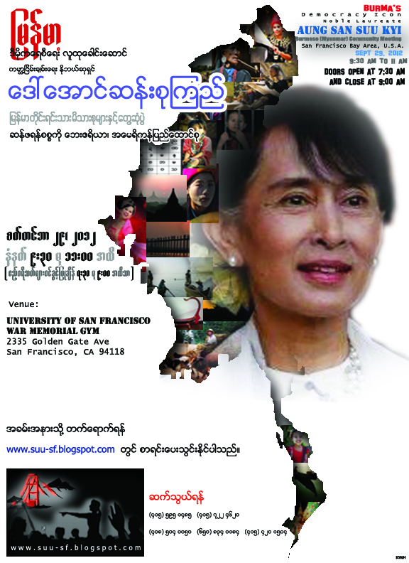 The President of National League for Democracy and Nobel Peace Laureate, Daw Aung San Suu Kyi will be meeting with San Francisco Bay Area Burmese Community on September 29, 2012 at University of San Francisco’s War Memorial Gymnasium located at 2335 Golden Gate Ave, San Francisco, CA 94118 from 9:30 am to 11:00 am.