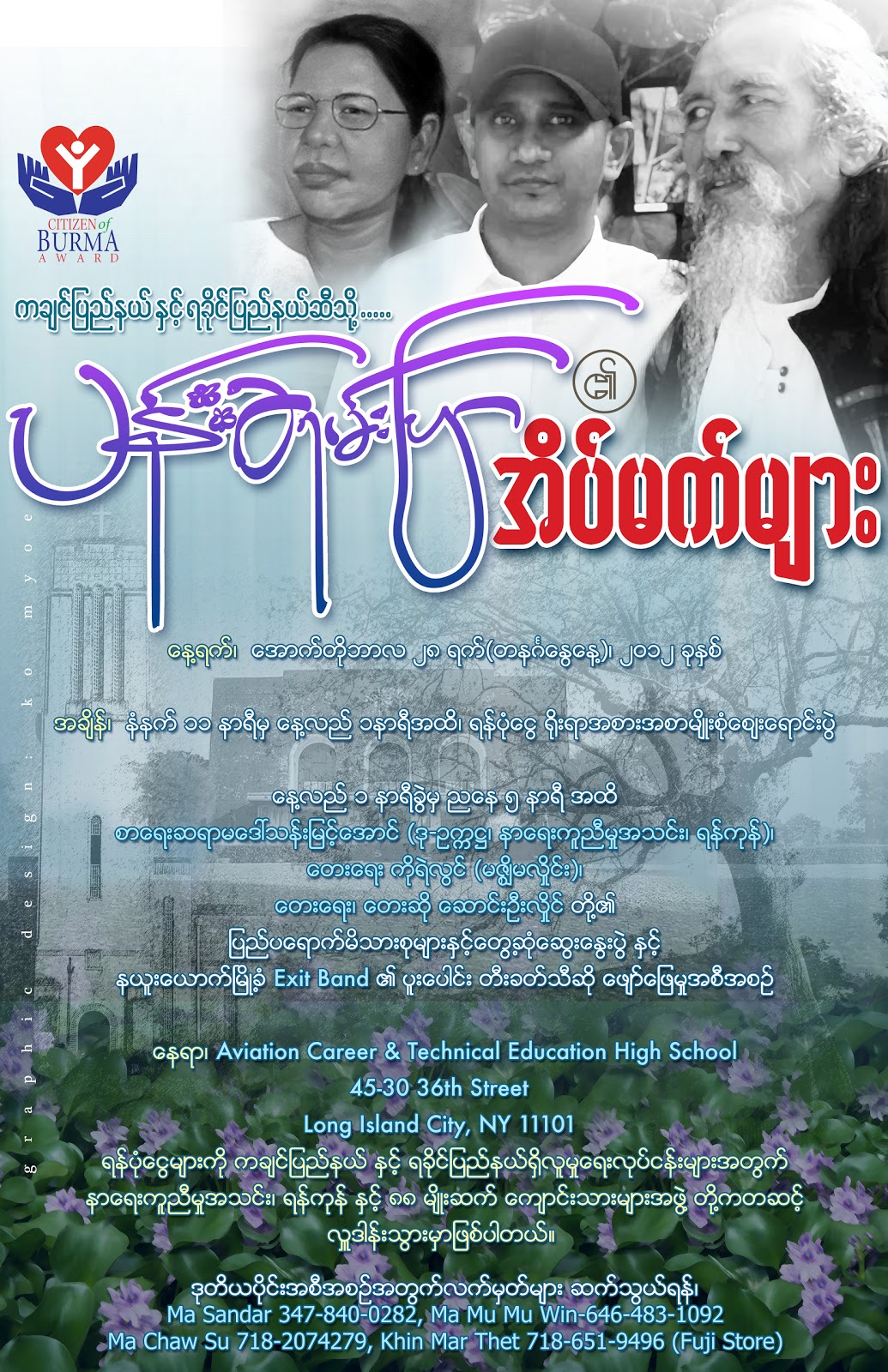စာေရးဆရာမေဒၚသန္းျမင့္ေအာင္ (ဒု–ဥကၠ႒၊နာေရးကူညီမႈအသင္း၊ရန္ကုန္)၊ေတးေရးကိုရဲလြင္ (မဇၩိမလိႈင္း)၊ေတးေရး၊ေတးဆိုေဆာင္းဦးလိႈင္တို႔၏ျပည္ပေရာက္မိသားစုမ်ားႏွင့္ေတြ႕ဆံုေဆြးေႏြးပြဲႏွင့္နယူးေယာက္ၿမိဳ႕ခံ Exit Band ၏ပူးေပါင္းတီးခတ္သီဆိုေဖ်ာ္ေျဖမႈအစီအစဥ္