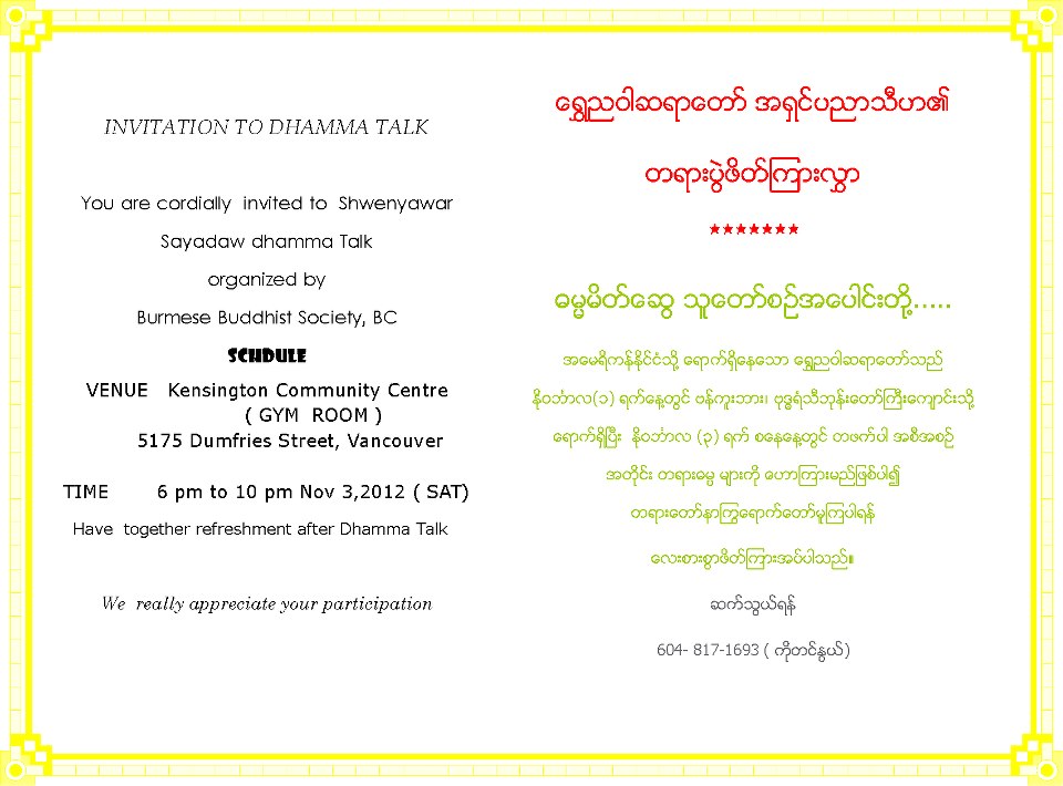 ကေနဒါႏိုင္ငံအတြက္ ပထမဆုံးတရားပြဲေတာ္ကို 5175,Dumfries street, Vancouver မွာရွိတဲ့ Kensington Community Center ရဲ့ အေဆာက္အဦတြင္းမွာ ေဟာေျပာမွာျဖစ္ပါတယ္။ ဒီတရားပြဲျဖစ္ေျမာက္ဖို ့ကို (စက္တင္ဘာ-၂၉ ) ကတည္းက ဝါရွင္တန္ျပည္နယ္မွာ ေရႊညဝါဆရာေတာ္ တရားလာေဟာစဥ္ ပင့္ေလွ်ာက္တင္စီစဥ္ခဲ့တာျဖစ္ပါတယ္္။ စီစဥ္သူမ်ားကေတာ့ ကေနဒါႏိုင္ငံရွိ ဗုဒၶရံသီဘုန္းႀကီးေက်ာင္းမွ ေဂါပကမ်ားျဖစ္ၾကတဲ့ ကိုစိန္ထြန္း၊ ကိုတင္ႏြယ္နဲ ့ ကိုကိုေလးတို ့ျဖစ္ပါတယ္။