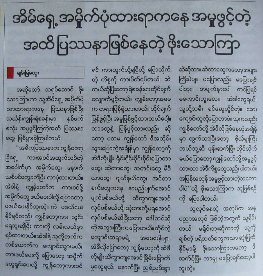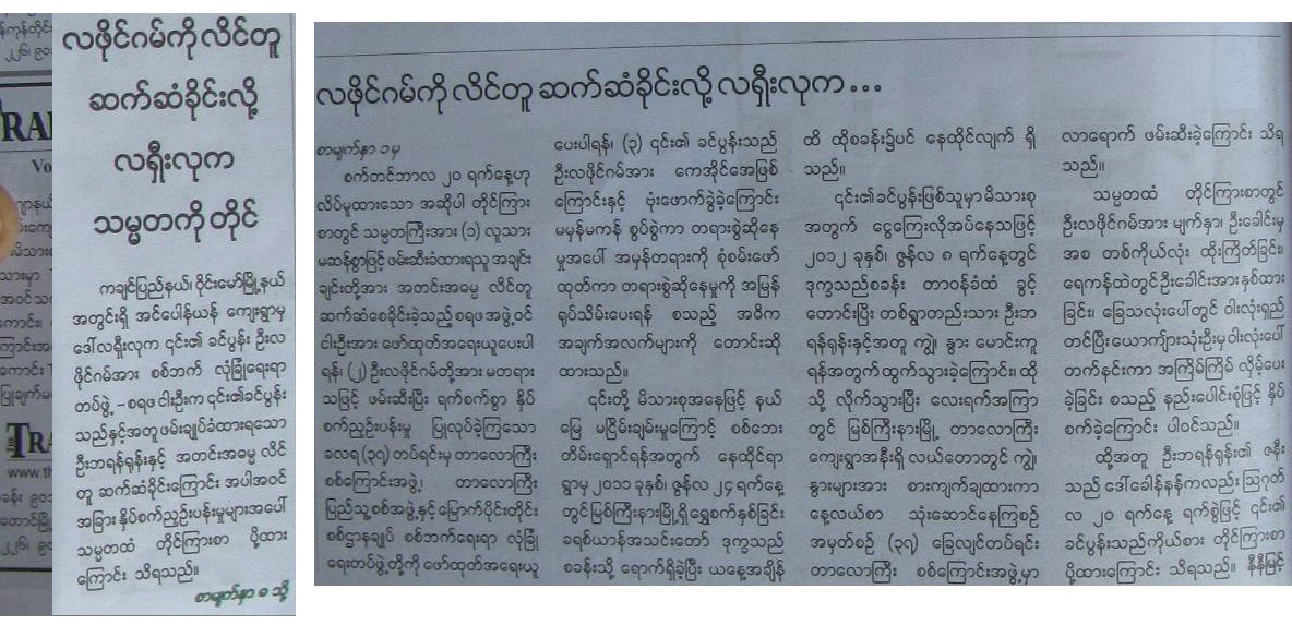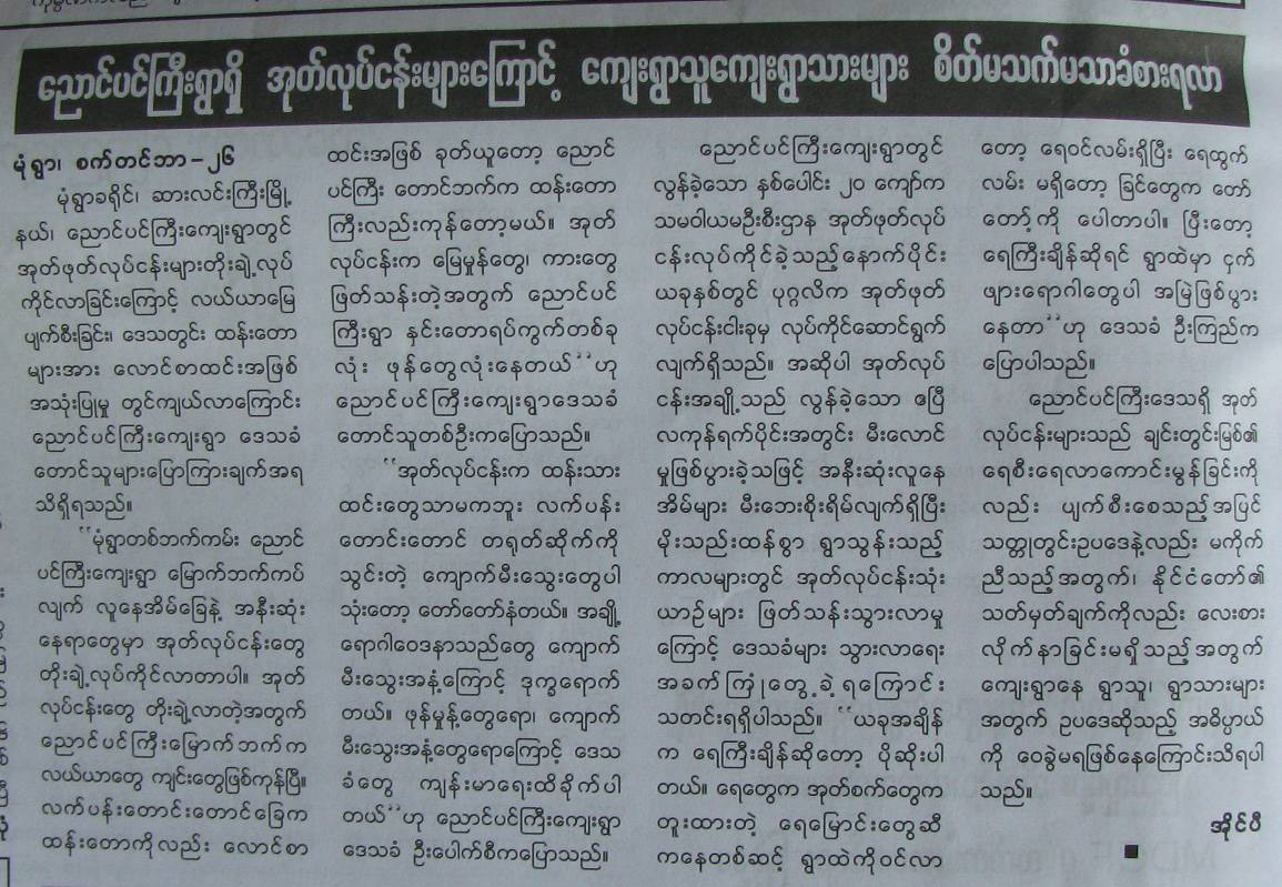 (ဒီလုိသတင္းမ်ဳိး ပထမဆုံးအႀကိမ္ ဂ်ာနယ္မွာ ေဖာ္ျပျခင္း ျဖစ္ဖြယ္ရိွပါတယ္။ ေက်းလက္ေဒသက လူ ၂ ဦးအမည္ကုိ သတင္းေခါင္းစဥ္မွာ တပ္ထားတာလည္း ပထမဆုံးျဖစ္ဖြယ္ရိွပါတယ္။)