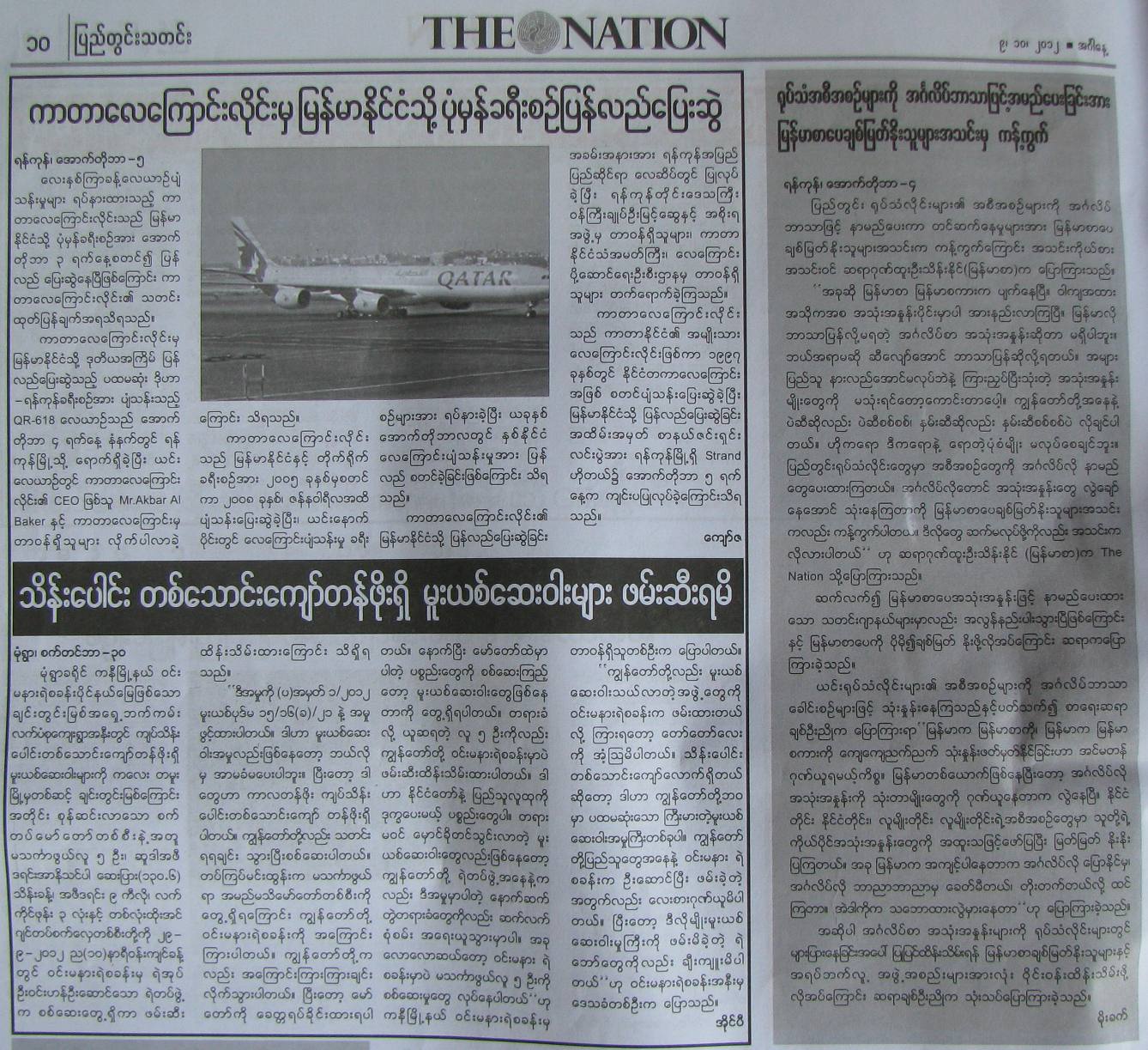 – ရုပ္သံအစီအစဥ္ အဂၤလိပ္လုိေပးျခင္းကုိ ျမန္မာစာေပခ်စ္ျမတ္ႏုိးသူမ်ားအသင္း ကန္႔ကြက္– ကာတာေလေၾကာင္းလုိင္း ျမန္မာျပည္ ျပန္ဆင္းမည္–