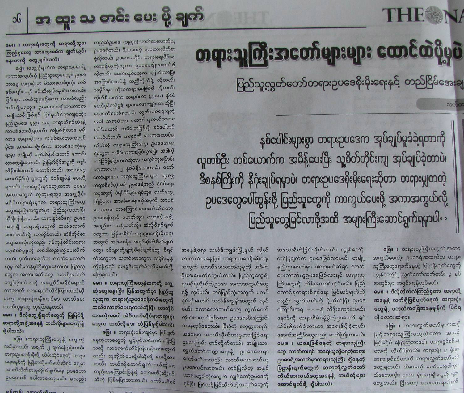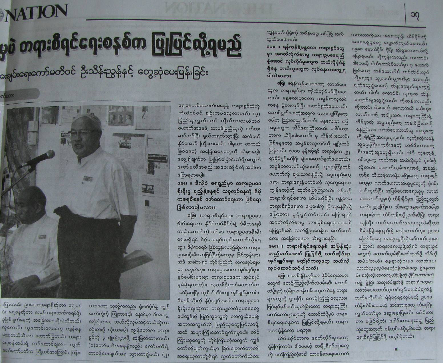 ဟုတ္ပါတယ္ – လႊတ္ေတာ္ရဲ႕ ဥပေဒစုိးမုိးေရး ေကာ္မတီ၀င္က ေျပာတာပါ။သူ႔ကုိ တုန္႔ျပန္တ့ဲစာ မၾကာေသးခင္က မုိးမခကုိ ေရာက္ပါတယ္။ မေဖာ္ျပျဖစ္ပါ။ စာပုိ႔သူက အင္တာဗ်ဴး ေဖာ္ျပခ့ဲရာ The Nation ဂ်ာနယ္ကုိ ပုိ႔သင့္တယ္ မဟုတ္လား။ အင္တာဗ်ဴးကုိ = Click = နဲ႔ = Click = မွာ ဖတ္ပါ။)