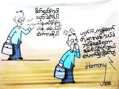 မွတ္ခ်က္။ ။ ဓာတ္ပုံ ဥကၠာမုိးျမင့္ ႐ုိက္ကူးထားသည့္ ေရေက်ာ္ ဒုတိယအႀကိမ္ကာတြန္းျပပြဲမွ ကာတြန္းျဖစ္ပါသည္။ ဤေနရာမွ ထပ္ဆင့္ကူးယူေဖာ္ျပပါသည္။ မူရင္းဓာတ္ပုံအား အနည္းငယ္ ျပန္လည္ျပဳျပင္ထားပါသည္။