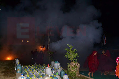 လက္ပံေတာင္းေတာင္၏ အေနာက္ဘက္တြင္ ဖြင့္လွစ္ထားေသာ သပိတ္စခန္း အမွတ္(၁) တြင္ ဆႏၵျပေနေသာ သံဃာေတာ္မ်ားႏွင့္ လူအားလံုး ဆိုင္ကယ္မ်ားကိုပဲ မယူႏိုင္ေတာ့ဘဲ ကိုယ္လြတ္ရုန္း ထြက္ေျပးခဲ့ရေၾကာင္း သတင္းရရွိပါသည္။