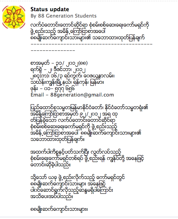 သံဃာဦးေဆာင္ ေတာ္လွန္ေရး မျဖစ္မီ ဖြဲ႔ခဲ့ၾကတယ္။ အေျခအေနေတြအရ ေက်ာင္းသားသမဂၢမ်ဳိးဆက္သစ္ကုိ ဗကသ သမိုင္းတာ၀န္လႊဲေပးခဲ့ၾကၿပီ …၈၈ မ်ဳိးဆက္ ဖြဲ႔တယ္ ေကာင္းပါတယ္ …. သူ႔ထူးျခားမႈနဲ႕သူ … သူ႔ကိုယ္ပုိင္ လကၡဏာနဲ႔ သူျဖစ္သြားၿပီ … ၂၀၀၇ မွာ ၈၈မ်ဳိးဆက္က လူထုတုိက္ပြဲကုိ ဦးေဆာင္ခဲ့တယ္ … ေကာင္းတယ္ … ေလးစားတယ္ … လူထုက သူတုိ႔အူထဲ