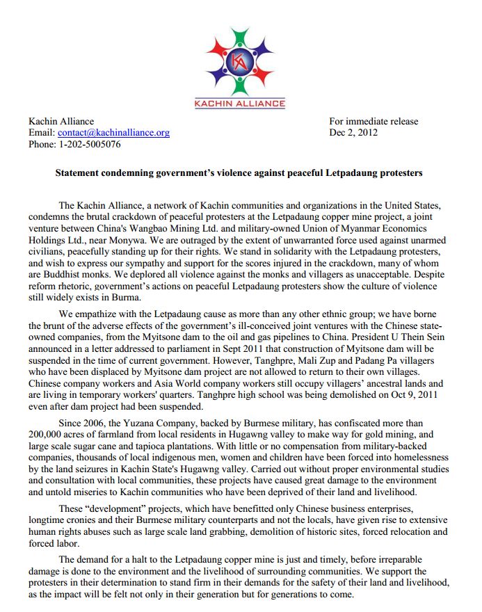 ကခ်င္မဟာမိတ္မ်ား Kachi Alliance က ယခင္အပတ္က ျဖစ္ပြားခဲ့တဲ့ လက္ပံေတာင္းေတာင္ အၾကမ္းဖက္သပိတ္ျဖဳိခြဲမႈကို ကန္႔ကြက္ရႈံခ်ေၾကာင္း သေဘာထား ထုတ္ျပန္ျပီး ျမန္မာျပည္သူေတြန႔ဲအတူ ရပ္တည္တယ္လို႔ ထုတ္ေဖာ္ေျပာၾကားခဲ့ၾကပါတယ္။