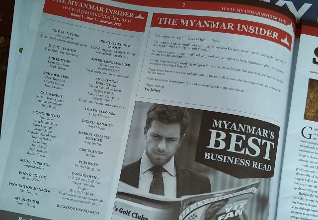 အဂၤလိပ္စာဖတ္ပရိသတ္ကုိ ပစ္မွတ္ထားၿပီး အဂၤလိပ္ဘာသာျဖင့္ လစဥ္ထုတ္မည့္ Myanmar Insider ဂ်ာနယ္သည္ ၿပီးခ့ဲသည့္ ေသာၾကာေန႔က စတင္ၿပီး စာနယ္ဇင္းေစ်းကြက္သုိ႔ ေရာက္ရိွလာသည္ကုိ ေတြ႔ရိွရသည္။
