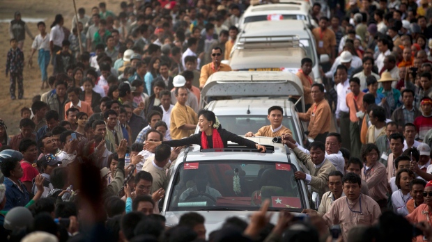 (Photo – Opposition leader Aung San Suu Kyi reaches for supporters as she leaves after a public meeting close to Letpadaung mine in Monywa, northwestern Myanmar, Friday, Nov. 30, 2012. (AP / Gemunu Amarasinghe)