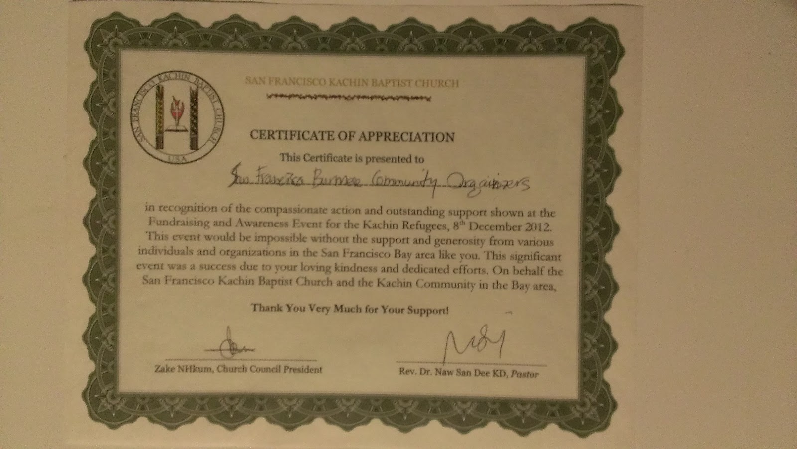 ကခ်င္စစ္ေဘးသင့္ဒုုကၡသည္မ်ားအတြက္ ရန္ပုုံေငြ ေစ်းေရာင္းပြဲကိုု San Francisco Kachin Baptist Church (USA), Citizen of Burma San Francisco Branch, Free Kachin Campaign, Kachin Heritage ႏွင့္ United Ethnic Nationalities Association စတဲ့ အဖြဲ႔အစည္းမ်ားအျပင္ ျမန္မာစီးပြားေရးလုုပ္ငန္းရွင္မ်ား ပညာရွင္မ်ားကလည္း ၀ိုုင္း၀န္း မတည္ျခင္း ျပဳခဲ့ၾကသည္။ ေဟာေျပာပြဲတြင္ Duwa Howa Ja La ႏွင့္ ဦးမင္းဇင္တိုု႔က ကခ်င္ျပည္နယ္အေရး ေျပာဆိုု ေဟာေျပာခဲ့ၾကသည္။ ကခ်င္စစ္ေဘး ဓာတ္ပုုံျပပြဲကိုုလည္း လူအမ်ားက စိတ္၀င္တစား ၾကည့္ရွႈအားေပးၾကသည္ကိုု ေတြ႔ရသည္။