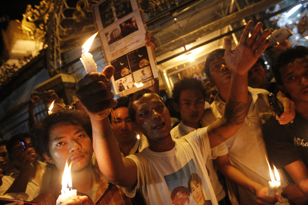 People in Burma have held candlelit vigils, such as this one in Rangoon last week, to protest the ongoing problem of power shortages. (PHOTO: Reuters) 2nd June 2012