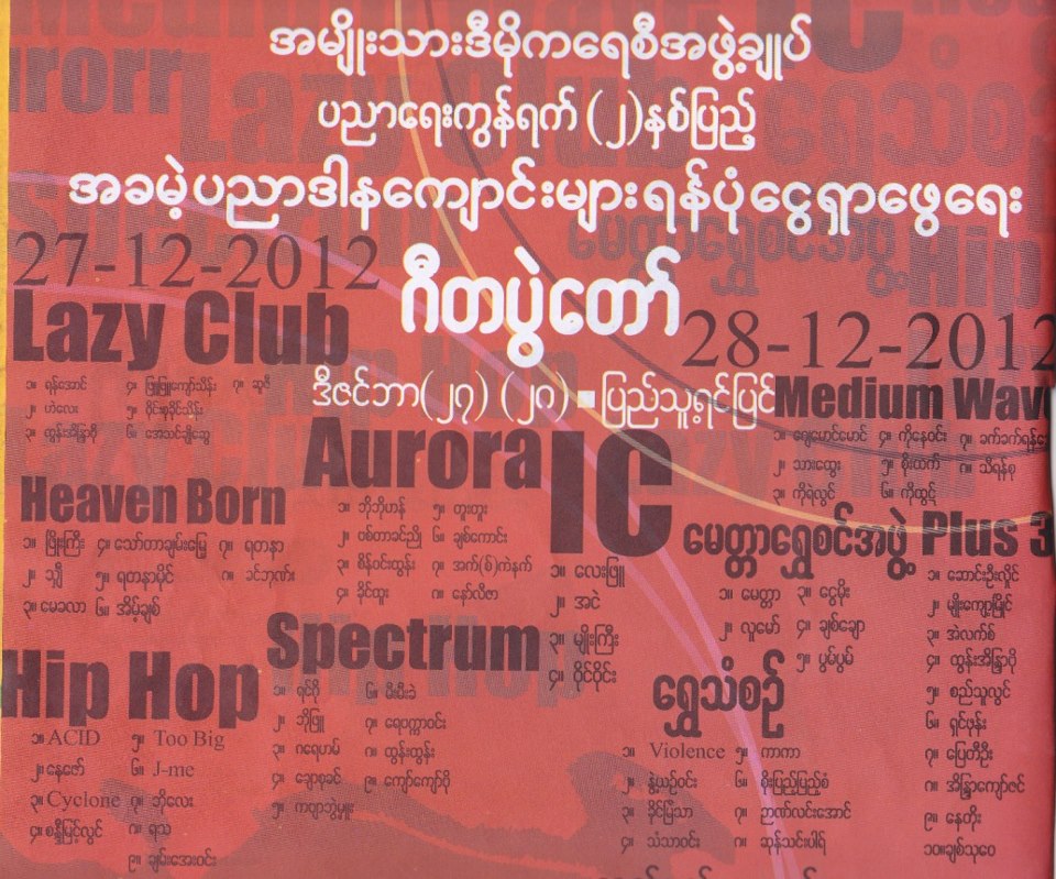 (၈) စြမ္းအင္ဖြံ ့ၿဖိဳးေရးဆိုင္ရာ ပညာဒါနေက်ာင္း (၃၅-လမ္း၊ေက်ာက္တံတားၿမိဳ ့နယ္) တို ့မွာ ေရာင္းခ်ေပးခဲ့ၿပီး ဂီတပြဲအတြက္ ၾကည့္ခြင့္လက္မွတ္မ်ား ကို (၁၅၀၀၀)က်ပ္၊ (၇၅၀၀)က်ပ္ ႏွစ္မ်ိဳးခြဲထားၿပီး လက္မွတ္ တေစာင္ကို (၂) ရက္ၾကည့္ရႈႏိုင္တယ္လို ့ သိရပါတယ္။