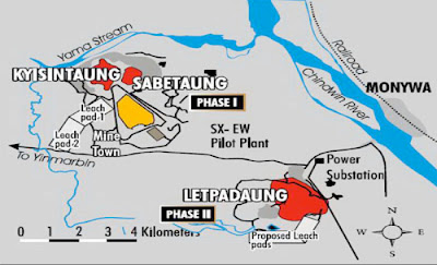 သ႔ိုဆိုပါကသတၱဳတြင္း မွထြက္ရွိလာေသာ စြန္႔ျပစ္ပစၥည္း (ေျမဆီလြာ၊ ဆင့္နိမ္ပယ္သတၱဳေရာေျမသား ႏွင့္ေက်ာက္သား၊ေက်ာက္နမ်ားႏွင့္ အက္စစ္ေရာေရဆိုးမ်ား) (Waste Materials; Soil & rock mixed with low grade trace Metal and acid waste water) ျပန္႔ၾကဲေနေသာဧရိယာအက်ယ္အ၀န္းမွာ လုပ္ငန္းသံုး ေျမေနရာ အက်ယ္အ၀န္းထက္ (၁၀)ဆမက က်ယ္ျပန္႔လာႏွိင္ပါသည္။