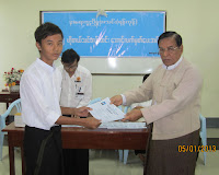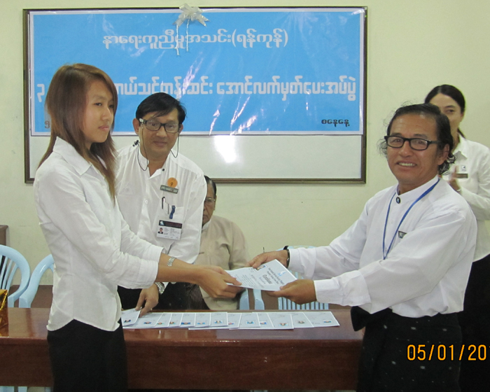 ၅.၁.၂၀၁၃ (စေနေန႔) တြင္ နာေရးကူညီမႈအသင္း(ရန္ကုန္)၏ ပညာေရးက႑အျဖစ္ အလုပ္ အကိုင္ရ႐ိွေရးအတြက္ တိုးခ်ဲ႕ဖြင့္လွစ္ ေဆာင္႐ြက္လာခဲ့ရာ ၃/၂၀၁၂ သင္တန္းဆင္း ေအာင္လက္မွတ္ ခ်ီးျမႇင့္ျခင္း အခမ္းအနားအား အမွတ္ (၁၃/က)၊ ၄၂ရပ္ကြက္၊ ဗိုလ္မွဴးဗထူးလမ္း၊ ဒဂံုၿမိဳ႕သစ္(ေျမာက္ပိုင္း)၌ နံနက္ (၁၀း၀၀) နာရီအခ်ိန္တြင္ က်င္းပခဲ့သည္။