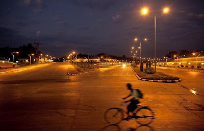 (Photo – A cyclist rides on vacant city streets at night in Nay Pyi Taw, Myanmar.
