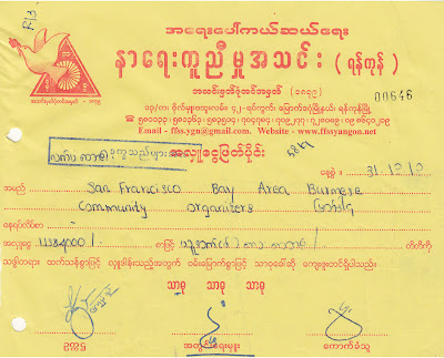 ထိုအတြက္ေၾကာင့္ ျပည္တြင္း အလွဴ႐ွင္မ်ားသာမက အေမရိကန္ႏိုင္ငံ႐ိွ ဆန္ဖရန္စစၥကိုေရာက္ ျမန္မာမ်ား(San Francisco Bay Area Burmese Community Organizer)မွ မၾကာေသးမီက ျဖစ္ပြားခဲ့ေသာ စစ္ကိုင္းတိုင္း၊ မံု႐ြာၿမိဳ႕၊ လက္ပန္းေတာင္ ေတာင္ ေၾကးနီစီမံကိန္း သပိတ္စခန္း ၿဖိဳခြဲမႈေၾကာင့္ မီးေလာင္ဒဏ္ရာ မ်ားရ႐ိွခဲ့ေသာ သံဃာေတာ္အေပါင္းႏွင့္ ျပည္သူတို႔အား ေဆးဝါးကုသရန္(၃၁.၁၂.၂၀၁၂)ရက္ေန႔တြင္ အမွတ္(၁၃/က) ဗိုလ္မွဴးဗထူးလမ္း၊ ၄၂ရပ္ကြက္၊ ဒဂံုၿမိဳ႕သစ္ (ေျမာက္ပိုင္း)သို႔ ယူအက္စ္ ေဒၚလာ(US$ 4000/-)အား လာေရာက္ လွဴဒါန္းခဲ့ၾကသည္။