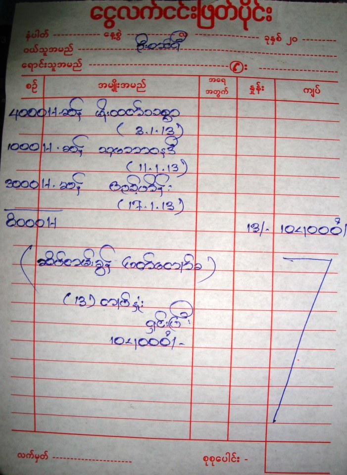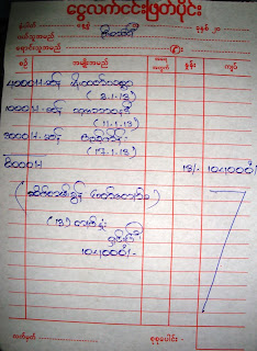 ( ၂၂ . ၁ .၂၀၁၃ ) ရက္ေန ့လာေကာက္ယူပါေသာ ဆိပ္ကမ္းခြန ္ျဖတ္ေက်ာ္ခေျပစာပါ။ လာေရာက္ေကာက္ခံသူကို အစည္းအေ၀းမွာတင္ျပျပီး ျဖစ္ေႀကာင္း၊ တရား၀င္ေျပစာေပးရန္ ကၽြန္ပ္မွေတာ