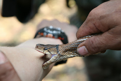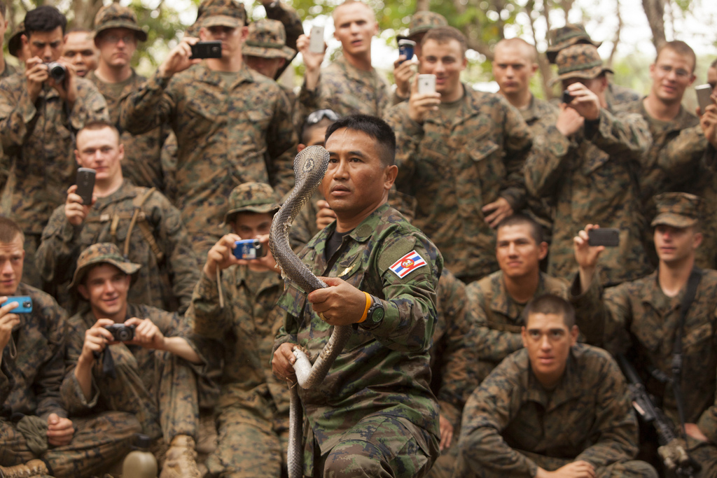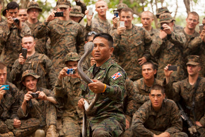 ေျမြဆုိးကိုက္ခံရျပီး ထုိေျမြအား မည္သုိ႔ ဖယ္ရွားရမည္ကုိ သရုပ္ျပေနပုံ။ အေမရိကန္စစ္သည္တုိ႔က ထုိသရုပ္ျပမႈတြင္ ၎တုိ႔၏ သေဘာဆႏၵျဖင့္ ပါ၀င္ ခ့ဲၾကေၾကာင္း၊ စစ္ဘက္ဆုိင္ရာ ေဆး၀န္ထမ္းမ်ားထုိေနရာတြင္ အသင့္ရိွေနေၾကာင္း သိရသည္။ |
