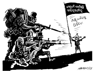 ယခု ေန႔ခ်င္းညခ်င္းပင္ နာမည္ေရာင္ကိုင္းလာေသာ“ေအာ္ခ်က္”ေဒါက္တာျမင့္စိန္ႏွင့္ သူ႔ရဲမ်ားက ေသနတ္ ဒုတ္ ဘတ္ခြ ဓားတို႔ျဖင့္လယ္သမားမ်ားအား “လယ္သမားဘ၀မွ လြတ္ေစမည္” ဆုေတာင္းသံဆန္းျဖင့္လည္းေကာင္း၊
