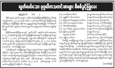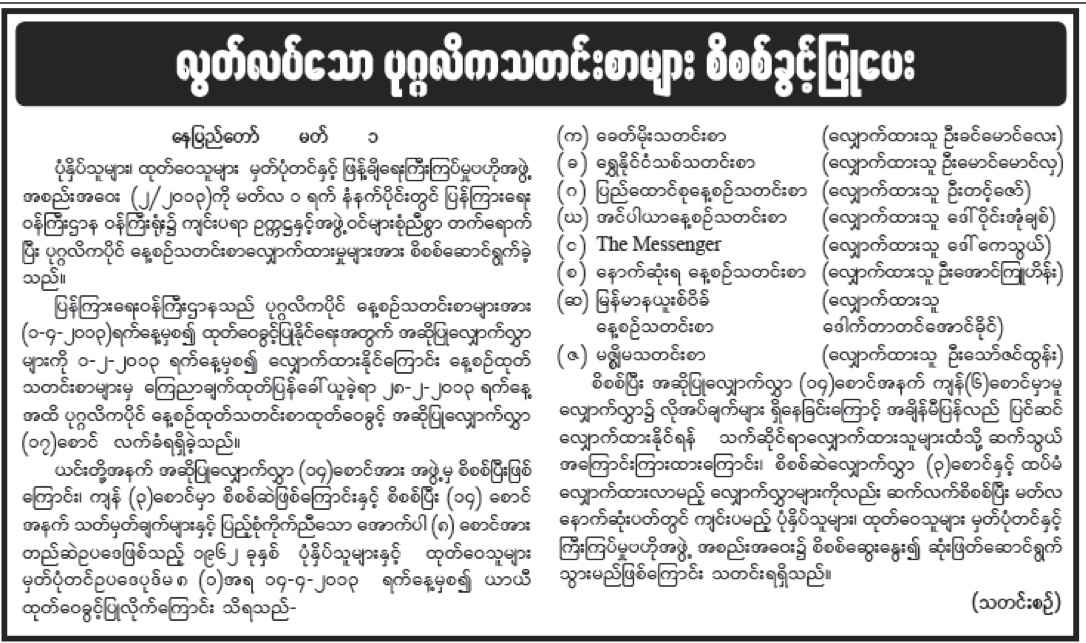 ဧၿပီ (၁၄)၊ ၂၀၁၃ ရက္ေန႔မွ စတင္၍ သတင္းစာ (၈) ေစာင္အား ယာယီထုတ္ေဝခြင့္ျပဳလိုက္ၿပီျဖစ္သည္