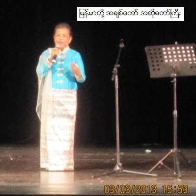 သို႔ႏွင့္ မေန႔က (မတ္လ ၃ ရက္၊ ၂၀၁၃) “ျပည္သူခ်စ္ေသာ ျမန္မာ့ဂႏၱ၀င္ဂီတမိခင္ႀကီး ေဒၚမာမာေအး၊ ဂုဏ္ျပဳ အမွတ္တရ ဂီတပေဒသာ” ပဲြႀကီးသို႔ သြားေရာက္ခဲ့ေလ၏။