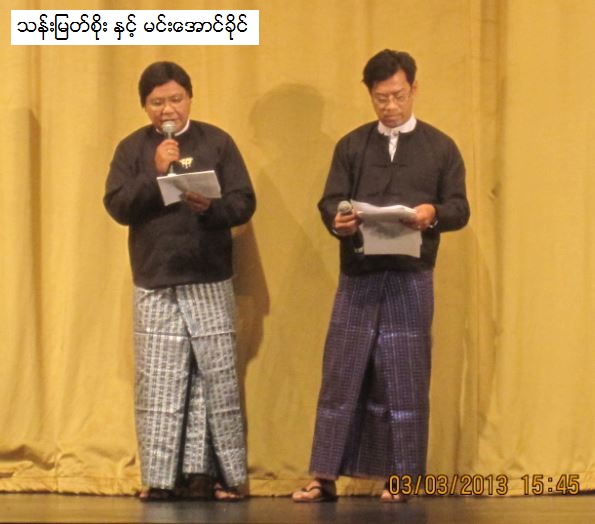 ခဏေနေတာ့ ခပ္လန္းလန္းေကာင္ေလးႏွင့္ ေကာင္မေလးတစ္ေယာက္ တက္လာကာ အစီအစဥ္မ်ား ေၾကျငာပါ သည္။ သူတုိ႔ေၾကျငာသည့္အထဲ၌ သီခ်င္းဆိုေနစဥ္ အတူဓါတ္ပံုတဲြရိုက္ျခင္းမ်ိဳးကဲ့သို႔ အေႏွာင့္အယွက္ျဖစ္ေစမည့္ အျပဳအမူ မ်ားကို မျပဳလုပ္ၾကပါရန္ ေတာင္းပန္ပါသည္ ဆုိတာလည္းပါ၏။ အဲေလ၊ ႏုိင္ငံျခားမွာ အေနၾကာေတာ့ ျမန္မာလို အသံုးအႏံႈး ေတြ ေမ့ေလ်ာ့ကုန္တာ ျဖစ္ပါလိမ့္မည္။