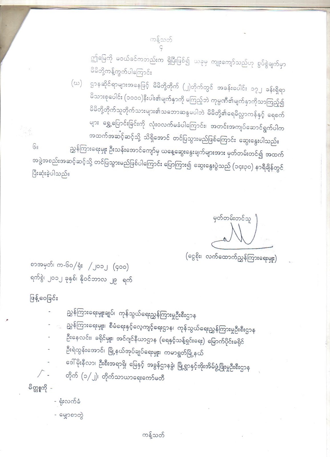 ၂၀၁၂ ႏို၀င္ဘာ(၂၃)ရက္ေန႔က ၿမိဳ႕နယ္အေထြေထြအုပ္ခဳဳပ္ေရးမွဴးရံုး အစည္းအေ၀းတြင္လည္း ေရကန္ႏွင္႔ မိလႅာကန္ေျပာင္းေရႊ႕ရန္စီစဥ္ျခင္းကို တုိက္ေကာ္မတီမွ တရား၀င္ကန္႔ကြက္ လက္မွတ္ထိုးထားၿပီး ျဖစ္ပါသည္ ၂၀၁၃ မတ္လ (၁၉)ရက္ေန႔တြင္ AA Medical Product မွ တိုက္ေနျပည္သူမ်ားႏွင္႔ ညိွႏိွုင္းၿပီးသေယာင္ ရန္ကုန္တိုင္းေဒသႀကီး အစိုးရအဖြဲ႔ကို မ်က္လွည္႔ျပ၍ ခြင္႔ျပဳခ်က္ရယူၿပီး လုပ္ငန္းမ်ား စတင္ေဆာင္ ရြက္ လာပါသျဖင္႔ တိုက္ေနျပည္သူမ်ားမွ မတရားသျဖင္႔ အဓမၼလုပ္ေဆာင္မွုမ်ားကို ကန္႔ကြက္ဆႏၵေဖၚထုတ္ သြားမည္ျဖစ္ပါေၾကာင္း တင္ျပအပ္ပါသည္။