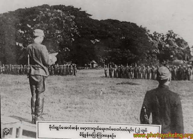 “ေအာင္ေျမနင္းၿပီး စစ္ေျမျပင္ ထြက္ရမယ္၊ ဆင္းရဲမယ္၊ ငတ္မယ္၊ အအိပ္ အစား ၊ အသြားအလာ အစစအရာရာ ဆင္းရဲမယ္။ ဒီဆင္းရဲေတြ ေက်ာ္လြန္ႏိုင္မွ စစ္ထြက္ျခင္းဟာ ေအာင္ျမင္ႏိုင္မယ္ဆိုတာ သတိျပဳပါ။ ဒီေတာ့ ဒီဆင္းရဲေတြကို ဂ႐ုမစိုက္ဘဲ ရင္ေျမကတုတ္ထားၿပီး ျမန္မာပီပီ ျမန္မာ့ေသြးျပၾကၿပီး ဒီေအာင္ပြဲကို ရေအာင္ႀကိဳးစားၾကပါ။ အထက္ဗိုလ္မ်ားရဲ႕ အမိန္႔ကို နာခံၾကပါ။ အထက္ဗိုလ္မ်ားကလည္း သာသာညီညီ မွ်မွ်တတ ဆင္းရဲအတူတူ၊ ငတ္အတူတူ၊ ေသအတူတူ ရဲေဘာ္အစစ္အျဖစ္ျဖင့္ ေအာင္ျမင္ေအာင္ ႀကိဳးစားရန္ တိုက္တြန္းလိုတယ္။ ရဲေဘာ္တို႔ကို ကတိေပးထားတဲ့အတိုင္း က်ဳပ္ကိုယ္တိုင္ ရဲေဘာ္တို႔ႏွင့္အတူ ခ်ီတက္မယ္။ ဗမာ့ရန္သူကို ေခ်မႈန္းၾက၊ အနီးကပ္ဆုံး ရန္သူကို ႐ွာၿပီးတုိက္ၾက၊ ဒါပဲ..”