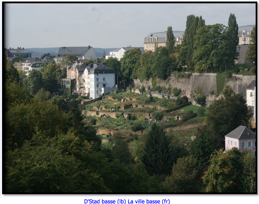 ဒီအၿမင့္ၿမိဳ႕ေဟာင္းရဲ႕တဘက္ ေဂ်ာက္ထဲကို ဆင္း သြားရင္ေတာ့ ေအာက္မွာေတာ့ အနိမ့္ပိုင္းမွာရွိလို႔ Ville Basse အနိမ့္ၿမိဳ႕လို႔ေခၚေနၾကတဲ့ မူလ ေရွးေဟာင္း Grund အမည္ရ ရပ္ကြက္ရွိပါတယ္၊ အဲဒီမွာေတာ့ ေအးခ်မ္းၿငိမ္သက္ တိတ္ဆိတ္လို႔ ေနပါတယ္၊ ၿမစ္ကေလးရယ္ ေခ်ာင္းေသးေသးေလးရယ္ ဘုရားေက်ာင္းရယ္ လံုးခ်င္းအိမ္ေလးမ်ား ၿမက္ခင္းမ်ား ပန္းဥယ်ာဥ္မ်ားသာ ရွိတဲ့ေနရာပါ၊