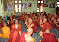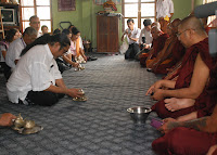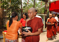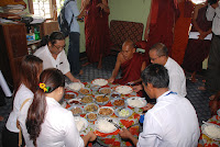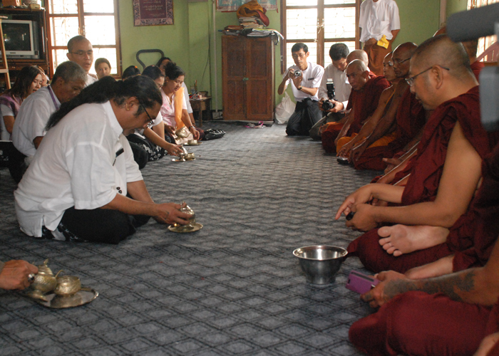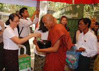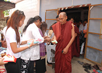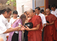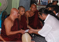 ယေန႔ ၁ဝ.၄.၂ဝ၁၃ ရက္ေန႔တြင္ နာေရးကူညီမႈအသင္း(ရန္ကုန္)မွ အမ်ားျပည္သူအလွဴ႐ွင္မ်ား၏ ကုသိုလ္ေကာင္းမႈအျဖစ္ အမွန္တကယ္ ၿငိမ္းခ်မ္းမႈအစစ္ကိုရ႐ိွေစမည့္ အလွဴတစ္ခုအျဖစ္ ကခ်င္ျပည္နယ္ ၿငိမ္းခ်မ္းေရးအတြက္ ရန္ကုန္ၿမိဳ႕မွ ကခ်င္ျပည္နယ္ လိုင္ဇာၿမိဳ႕အထိ လမ္းေလွ်ာက္ခဲ့ၾကေသာ ၿငိမ္းခ်မ္းေရး လမ္းေလွ်ာက္အဖြဲ႔တြင္ ပါဝင္ခဲ့ေသာ သံဃာေတာ္ (၁၅) ပါးႏွင့္ လူငယ္ (၁၉) ဦးႏွင့္ ကိုရင္ (၂) ပါးတို႔အား သိကၡာထပ္၊ ရဟန္းခံ ၿငိမ္းခ်မ္းေရးအလွဴေတာ္မဂၤလာပြဲႀကီးအား ေျမာက္ဒဂံုၿမိဳ႕နယ္၊ ၇ – ရပ္ကြက္႐ွိ တကၠ သီလာမဟာေဇယ်သဒၶိပ႒ါန္းေက်ာင္းတိုက္ႀကီးတြင္ က်င္းပျပဳလုပ္ခဲ့ၾကသည္။ ယင္း ၿငိမ္းခ်မ္းေရးအဖြဲ႔အား ရန္ကုန္လိုင္ဇာခရီးစဥ္တြင္ နာေရးကူညီမႈအသင္း(ရန္ကုန္)မွ အလွဴေငြမ်ားႏွင့္ အသံုးပစၥည္းမ်ားအား လွည္းကူးၿမိဳ႕တြင္ တစ္ႀကိမ္၊ မႏၲေလးၿမိဳ႕တြင္ တစ္ႀကိမ္ လွဴဒါန္းကူညီ ပံ့ပိုးေပးခဲ့သည္။ ထိုၿငိမ္းခ်မ္းေရး လမ္းေလွ်ာက္အဖြဲ႔သည္ လိုင္ဇာၿမိဳ႕အထိ ေအာင္ျမင္စြာလမ္းေလွ်ာက္ကာ ရန္ကုန္သို႔ ျပန္လည္ေရာက္႐ိွခဲ့ ၾကေသာ္လည္း ကခ်င္ျပည္နယ္တြင္ စစ္ပြဲမ်ားထပ္မံျဖစ္ပြားေနခဲ့သည္။ ထို႔ေၾကာင့္ စစ္မွန္ေသာ ၿငိမ္းခ်မ္းမႈ ကိုရ႐ိွေစရန္အလို႔အငွာ သာသနာ့ေဘာင္သို႔ဝင္ေရာက္ရန္ ဆႏၵျဖစ္ေပၚလာသျဖင့္ နာေရးကူညီမႈအသင္း (ရန္ကုန္)မွ ႐ွင္ျပဳရဟန္းခံ၊ သိကၡာထပ္အလွဴပြဲႀကီးအား စီစဥ္က်င္းပ ျပဳလုပ္ေပးခဲ့သည္။ အလွဴပြဲအား နံနက္ (၉းဝဝ) နာရီအခ်ိန္တြင္ ဦးေက်ာ္သူႏွင့္ အသင္းသူ/သားမ်ားတို႔မွ ေရစက္သြန္းခ်ကာ သတၱဝါ အားလံုးက အမွ်ေဝခဲ့ၾကသည္။ ၄င္းအလွဴပြဲသို႔ ေ႐ႊညဝါဆရာေတာ္ႀကီး တက္ေရာက္ခ်ီးျမႇင့္ကာ ဖိတ္ၾကား ထားေသာ ဧည့္သည္မ်ားႏွင့္ ႏိုင္ငံေရးအဖြဲ႔အစည္းမ်ား၊ လူမႈေရးအဖြဲ႔အစည္းမ်ားႏွင့္ မီဒီယာအသီးသီးတို႔မွ တက္ေရာက္ခဲ့ၾကသည္။