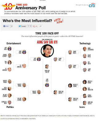TIME မဂၢဇင္းက ကမာၻေပၚမွာလႊမ္းမိုးမႈအရွိဆံုးပုဂၢိဳလ္ေတြကို ႏွစ္စဥ္အေယာက္ ၁၀၀ ေရြးေလ့ရွိတဲ့ ပြဲေလးတစ္ခုကို သူ႕ထံုးစံအတုိင္းက်င္းပ လုိက္ျခင္းပါ။ အဲဒီ့မွာ က်ေနာ္တို႕အတြက္ ထူးျခားသြားတာက က်ေနာ္တို႕ႏုိင္ငံရဲ႕ ဒီမိုကေရစီေခါင္းေဆာင္ ေဒၚေအာင္ဆန္းစုၾကည္ဟာ အျခား နာမည္ႀကီးပုဂိၢဳလ္ေတြကို ေက်ာ္ျဖတ္လာၿပီး ေနာက္ဆံုးမွာ ကမာၻေက်ာ္ အဆိုေတာ္ အႏုပညာရွင္ ေလဒီဂါဂါနဲ႕ ယွဥ္ၿပိဳင္ရတဲ့အေျခအေနအထိေရာက္လာျခင္းပါပဲ။ က်ေနာ္အထက္မွာေျပာခဲ့တဲ့ အြန္လိုင္းက မဲေပးေရြးခ်ယ္ပြဲႏွစ္ခုစလံုးရဲ႕ မဲေပးေရြးခ်ယ္ရတဲ့စနစ္ ေတြကိုၾကည့္တဲ့အခါ စက္တစ္လံုးတည္းကေန အႀကိမ္ႀကိမ္မဲေပးခြင့္ျပဳထား တာကိုေတြ႕ရပါတယ္။ အဲဒီ့အခြင့္အေရးကို မိမိရရအသံုးခ်ၿပီး ျမန္မာအလွမယ္ နန္းခင္ေဇယ်ာကို ျမန္မာေတာ္ေတာ္မ်ားမ်ားဟာ မ်ိဳးခ်စ္စိတ္ဓါတ္အရင္းခံၿပီး တစ္ဦးတစ္ေယာက္တည္းကေန အႀကိမ္ႀကိမ္မဲေပးခဲ့ၾကၿပီး နန္းခင္ေဇယ်ာလည္း Miss Internet 2012 ဆုကိုဆြတ္ခူးခဲ့ပါတယ္။ အဲဒီ့လို တစ္ေယာက္တည္းက အႀကိမ္ႀကိမ္ မဲေပးေနတာနဲ႕ပတ္သက္ၿပီး လုပ္သင့္တယ္ မလုပ္သင့္ဘူး၊ က်င့္ဝတ္နဲ႕ညီတယ္ မညီဘူး စသည္ျဖင့္ အျငင္းပြားမႈေတြလဲ အြန္လိုင္းႏုိင္ငံသားေတြၾကားထဲမွာ အေျမာက္အမ်ားေပၚလာခဲ့ပါတယ္။ တစ္ေယာက္တည္းက အႀကိမ္ႀကိမ္မဲ ေပးတာကို မတရားလုပ္တယ္လို႕ခံစားၿပီး ကန္႕ကြက္တဲ့သူေတြရွိသလုိပဲ … မဲဝင္မေပးရင္ပဲ မ်ိဳးခ်စ္စိတ္ဓါတ္မရွိတဲ့သူ၊ ျမန္မာမပီသတဲ့သူစသည္ျဖင့္ စြပ္စြဲေျပာဆိုခ်င္ၾကတဲ့ သူေတြလဲေတြ႕ရပါတယ္။ ေဒၚေအာင္ဆန္းစုၾကည္နဲ႕ ေလဒီဂါဂါတို႕ရဲ႕ ယွဥ္ၿပိဳင္မႈက ပိုၿပီးျပင္းထန္ပါတယ္ … ဘာျဖစ္လို႕လဲဆိုေတာ့ Miss Myanmar တုန္းကလို ႏုိင္ငံေတြအမ်ားႀကီးထဲက ကိုယ့္ႏုိင္ငံသူကို မဲေပးရတာမ်ိဳးမဟုတ္ပဲ … ႏွစ္ေယာက္ယွဥ္ၿပီးမဲေပးရတာမို႕ပါ။ TIME မဂၢဇင္းရဲ႕ အြန္လိုင္းစာမ်က္ႏွာကလည္း ယွဥ္ၿပိဳင္ပြဲကို စိတ္ဝင္စားစရာေကာင္းေအာင္ % ေတြကို အခ်ိန္မွန္ တင္ေပးေနပါေသးတယ္။ မ်ိဳးခ်စ္စိတ္ေၾကာင့္ပဲျဖစ္ျဖစ္၊ ကိုယ္ခ်စ္ျမတ္ႏိုးတဲ့သူကို အႏိုင္ရေစခ်င္လို႕ပဲျဖစ္ျဖစ္ … ၿပိဳင္ပြဲစည္းကမ္းေဘာင္ထဲကေန ကိုယ္ႏွစ္သက္သလို မဲေပးၾကတာဟာ ကိုယ့္အခြင့္အေရးကို ကိုယ္အသံုးခ်တာျဖစ္လို႕ဘာမွျပႆနာမရွိပါဘူး။ အျခားသူေတြ စိတ္မဝင္စားလုိ႕ အဲဒီ့ပြဲကို ဝင္မႏႊဲၾကတာကလည္း သူတို႕ရဲ႕အခြင့္အေရးပါပဲ။ ကိုယ္ယံုၾကည္ရာကိုယ္လုပ္ေနၾကတဲ့အေပၚ ဘယ္သူ႕ ဘယ္သူ႕ကိုမွ မထိခုိက္ဘူးဆိုရင္ … က်ေနာ္တို႕ လြတ္လပ္စြာကြဲလြဲခြင့္ေပးသင့္ပါတယ္။ မအိပ္မေနမဲေပးေနၾကတဲ့သူေတြကို အလုပ္မရွိအကိုင္မရွိ အားေနၾကတယ္လို႕ အျပစ္တင္တာ၊ မဲမေပးတဲ့သူေတြကို မ်ိဳးခ်စ္စိတ္ဓါတ္မရွိသူေတြလို႕ စြပ္စြဲတာ စတဲ့လုပ္ရပ္ေတြဟာ … သူတစ္ပါးရဲ႕ အခြင့္အေရးကိ