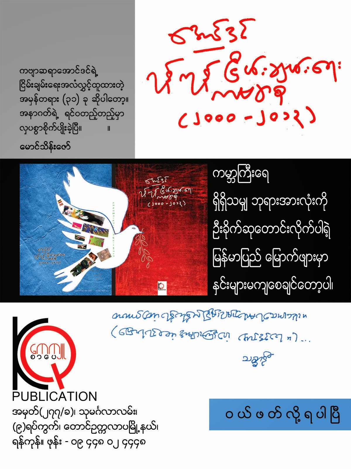 ေကက်ဳ စာေပတိုက္ကထုတ္ေ၀ျပီး အေမရိကန္ေရာက္ ကဗ်ာဆရာ ေအာင္ဒင္ရဲ့ ျမန္မာဘာသာျဖင့္ ေရးဖြဲ႔တဲ့ “ရန္ကုန္ျငိမ္းခ်မ္းေရး ကဗ်ာစု (၂၀၀၀ – ၂၀၁၃) ထြက္ပါျပီ။ ပိုစတာမွာ ေရးထားတာက “၀ယ္ဖတ္လို႔ ရပါျပီ” တဲ့။