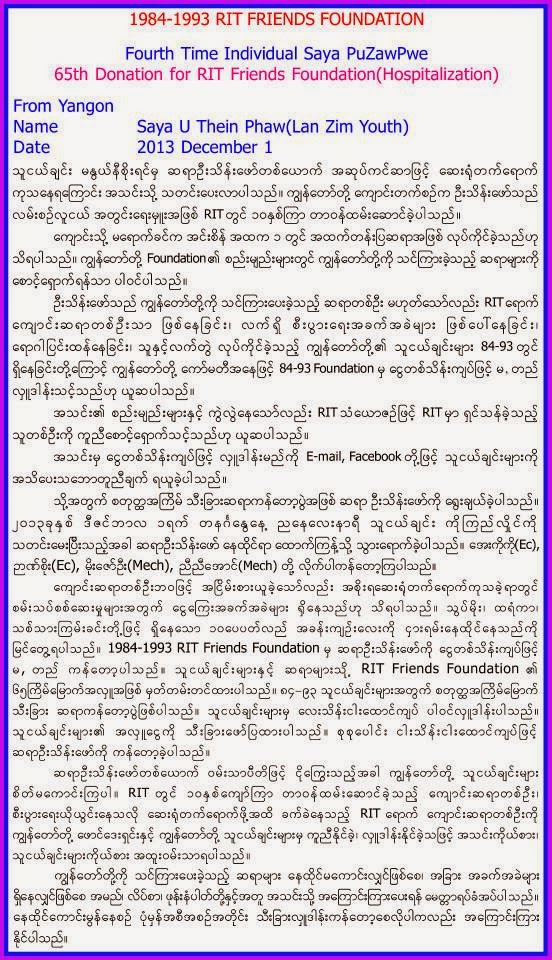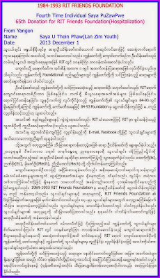 ၁၉၈၄-၁၉၉၃ ပညာသင္ႏွစ္အတြင္း ဆုံစည္းခဲ့ၾကတဲ့ ရန္ကုန္စက္မႈတကၠသိုလ္ေက်ာင္းသားေဟာင္းမ်ား ေဖာင္ေဒးရွင္းက က်န္းမာေရးအကူအညီ လိုအပ္ေနတဲ့ ဆရာဦးသိန္းေဖာ္ (လမ္းစဥ္လူငယ္)ကို သီးျခားကန္ေတာ့ခဲ့ၾကတယ္လို႔ သိရပါတယ္။ စာသင္ေပးတဲ့ ဆရာတဦးမဟုတ္ေပမယ့္ လူမႈေရးေစတနာ ဂါရ၀စိတ္နဲ႔ မိတ္ေဆြမ်ားကလည္း ထပ္မံ ထည့္၀င္ၾကတာေၾကာင့္ ေဖာင္ေဒးရွင္းက မတည္ေငြ က်ပ္ ၁ သိန္းအျပင္ ေနညပ္ထပ္ က်ပ္ ၄ သိန္း ၅ ေထာင္ စုေဆာင္းျပီး ေပးအပ္ႏိုင္ခဲ့တယ္လုိ႔ ဆိုပါတယ္။ တာ၀န္ခံေတြထဲက ကိုေအးကိုကို၊ ကိုဥာဏ္စိုး၊ ကိုမိုးေဇာ္ဦးနဲ႔ ကိုညီညီေအာင္တို႔က ဦးသိန္းေဖာ္ ေနအိမ္ကို သြားေရာက္ လွဴဒါန္းခဲ့တယ္လို႔ သိရပါတယ္။
