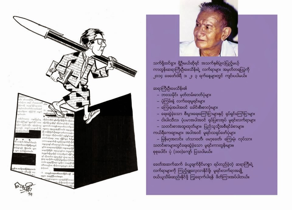 ျမန္မာ့အလင္း၊ ဟံသာ၀တီ၊ ဗမာ့ေခတ္၊ ေၾကးမုုံ၊ လုုပ္သား စသည့္သတင္းစားမ်ားတြင္ ေရးဆြဲထားခဲ့သည့္ သူ႔ကာတြန္း မူရင္းလက္ရာေတြကုုိ ၾကည့္႐ႈလုုိသူေတြ၊ ၀ယ္ယူသိမ္းဆည္းထားလုုိသူေတြကုုိ လာေရာက္ၾကဖုုိ႔ကုုိလည္း ဖိတ္ၾကားထားပါတယ္။