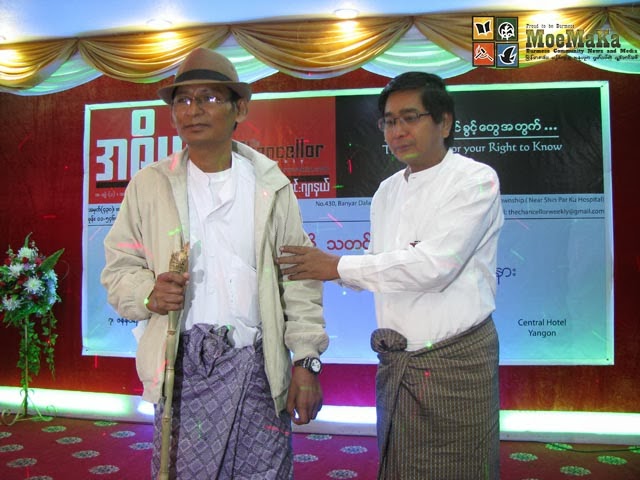 ရန္ကုန္မွာ လုပ္ခ့ဲတ့ဲ ဂ်ာနယ္မိတ္ဆက္ပဲြေရာက္ ႏုိင္က်ဥ္းေဟာင္းတဦးနဲ႔ အယ္ဒီတာခ်ဳပ္  ထြန္းေဇာ္ေဌး(ဓာတ္ပုံ – ဆူးအယ္လ္လင္း/မုိးမခ)