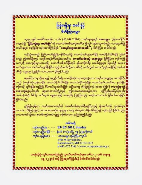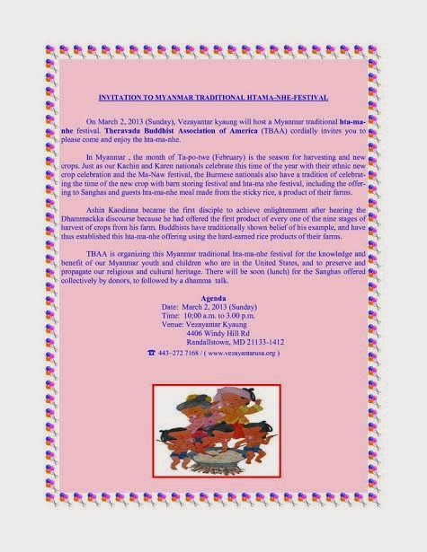 ျမန္မာ ရိုးရာ အစဥ္အလာ ပြဲတခုကို ျမန္မာလူငယ္မ်ားသိရွိႏွဳိင္ရန္ႏွင့္ ဘာသာ ယဥ္ေက်းမႈမ်ား မေပ်ာက္ပ်က္ေစရန္ ရည္ရြယ္က်င္းပျပဳလုပ္ျခင္းျဖစ္သည္။ ျမန္မာမိသားစုမ်ား တေပ်ာ္တပါး စုံစုံညီညီတက္ေရာက္ႏွဳိင္ရန္လည္းႏွဳိးေဆာ္ ဖိတ္ၾကားထား ေၾကာင္းသိရွိရသည္။ မတ္လ ၂ရက္ တနဂၤေႏြေန႔ နံနက္ ၁၀နာရီမွ ေန႔လည္၃နာရီအထိ -ေဝဇယႏာၱ ဘုန္းေတာ္ၾကီးေက်ာင္း- 4406- Windy Hall Rd- Randallstown MD 21133-1412 သို႔ၾကြေရာက္ပါရန္ႏွင့္ အလွဴဒါန တြင္ ပါဝင္လိုသူ မည္သူမဆို ဖုန္း -443 272 7168 သို႔၎ (www.vezayantarusa.org) သို႔ဆက္သြယ္ ႏုုိင္ေၾကာင္းသိရွိရသည္။