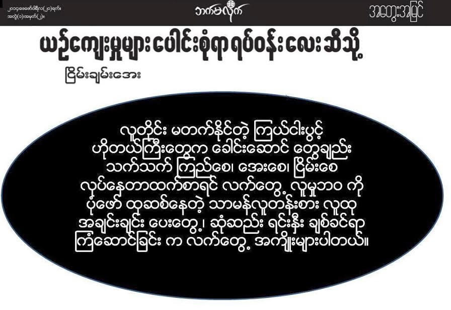 ဒါေၾကာင့္ ပညာေရး စနစ္၊ စာနယ္ဇင္း၊ စာေပ၊ သဘင္၊ ရုပ္ရွင္၊ မီဒီယာစံု ျပဳျပင္ေျပာင္းလဲေရးေတြနဲ႔ အတူ လူထု အခ်င္းခ်င္း ပိုမိုဆံုေတြ႕ ရင္းႏွီးခြင့္ တည္ေဆာက္ႏိုင္တဲ့ ဘာသာ/လူမ်ိဳး စံုယဥ္ေက်းမႈ ပြဲေတာ္မ်ား ခပ္မ်ားမ်ား၊ ဗမာျပည္ရဲ႕ ၿမိဳ႕ရြာ အႏွံ႔ လူအမ်ား တကယ္ လက္လွမ္းမီ တက္ႏိုင္တဲ့ ေနရာမ်ိဳးမွာ က်ယ္က်ယ္ျပန္႔ျပန္႔ စီစဥ္ ျပဳလုပ္ဖို႔ လိုေနေၾကာင္း သက္ဆိုင္ရာ အစုိးရ အဖြဲ႕အစည္း တာဝန္ရွိသူမ်ား၊ ဘာသာေရး အဖြဲ႕အစည္း ေခါင္းေဆာင္မ်ား နဲ႔ လူထု အမ်ား သိျမင္ေစဖို႔ အလို႔ငွာ တည္ၿငိမ္၊ ေအးခ်မ္း၊ ဖြံၿဖိဳးတိုးတက္ေစရာ “ယဥ္ေက်းမႈမ်ား ေပါင္းစံုရာ ရပ္ဝန္းေလး ဆီသို႔..” ရည္သန္ ေဆြးေႏြးတင္ျပလိုက္ေၾကာင္းပါ။