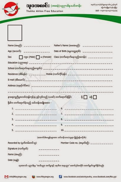 နာေရးကူညီမႈအသင္း(ရန္ကုန္) သုခအလင္း ပညာဒါနမွ ၂ဝ၁၄ ခုႏွစ္ ေႏြရာသီကာလတြင္ ေႏြရာသီအဂၤလိပ္စာ (4 – Skills) သင္တန္းအား ေစတနာ့ ပညာဒါန ဆရာ/မမ်ားတို႔မွ သင္ၾကားပို႔ခ်မည္ ျဖစ္ပါသည္။ တက္ေရာက္လိုသူမ်ားအေနျဖင့္ နာေရးကူညီမႈအသင္း (ရန္ကုန္) ႐ံုးခ်ဳပ္ အမွတ္ (၁၃/က)၊ ဗိုလ္မွဴးဗထူးလမ္း၊ ၄၂ ရပ္ကြက္၊ ေျမာက္ဒဂံုၿမိဳ႕နယ္၊ ရန္ကုန္ၿမိဳ႕သို႔ ေအာက္ပါ Application Form ျဖင့္ ၅.၃.၂ဝ၁၄ (ဗုဒၶဟူးေန႔) ညေန (၅းဝဝ) နာရီေနာက္ဆံုးထား၍ လာေရာက္၍ ေလွ်ာက္ထားႏိုင္ပါသည္။ အေသးစိတ္သိ႐ွိလိုပါက နာေရးကူညီမႈအသင္း (ရန္ကုန္) ဖုန္း ၅၈ဝ ၁၃၃ သို႔ ဆက္သြယ္ေမးျမန္းႏိုင္ ပါသည္။