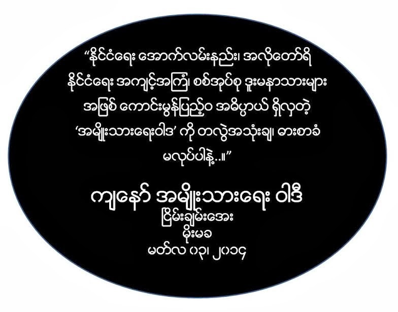 စစ္မွန္တဲ့ အမ်ိဳးသားေရးဝါဒီ တေယာက္က တမ်ိဳး၊ တဘာသာ တည္း သီးသန္႔ ေျပာဆို ေဆြးေႏြးမႈမ်ိဳး၊ အျမင္မ်ိဳး၊ က်ဥ္းေျမာင္းမႈမ်ိဳး ဘာအေၾကာင္းျပခ်က္နဲ႔မွ မလုပ္အပ္ဘူး။