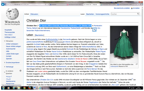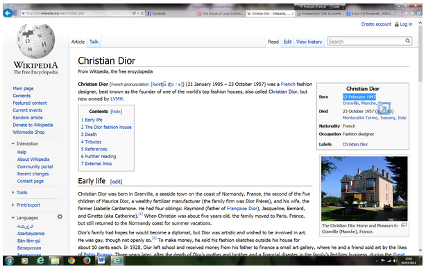 အဂၤလိပ္ ဝီကီရဲ႕ အလြဲအမွားတခုပါ၊ Christian Dior ရဲ႕ ေမြးတဲ့ခုႏွစ္ကို အလယ္က စာကိုယ္ေနရာမွာ 21 January 1905 လို႔ေရးထားၿပီး ညာဘက္ေနရာမွာေတာ့ 12 February 1947 လို႔ ေရးထားတာကို ေတြ႔ရပါတယ္၊