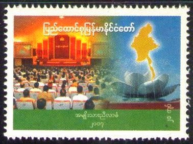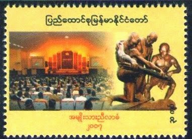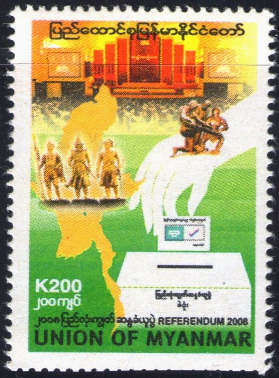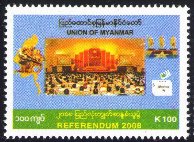 “၂၀၀၈ ေမလ နာဂစ္မုန္းတုိင္းအပီးမွာ ျပည္လုံးကြ်တ္ဆႏၵခံယူပဲြလုပ္ပီး- အေျခခံဥပေဒကုိ အတင္းအတည္ျပဳလုိက္တယ္ေလ။ အဲဒီအတြက္ တံဆိပ္ေခါင္း ၃လုံးလဲ ထုတ္လုိက္ေသးတယ္။ ဒီမွာၾကည့္ပါဦးကြာ။ ဘယ္ေလာက္အသဲနာစရာေကာင္းတဲ့ တံဆိပ္ေခါင္းေတြလဲဆုိတာ”