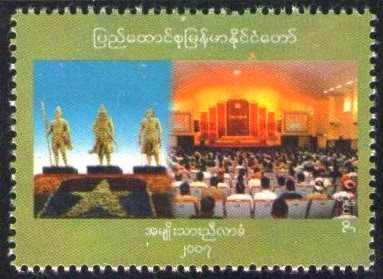 “ငါ့တူႀကီး “စကားထဲက၊ ဇာတိျပ” ဆုိတဲ့စကားၾကားဖူးတယ္မဟုတ္လား။ အခုဟာကလဲ “တံဆိပ္ေခါင္းထဲက၊ ဇာတိျပ” ကြ။ ဟား-ဟား။ ဘာဇာတိလဲဆုိေတာ့ “ တုိ႔ ၾကည္း၊ ေရ၊ ေလ ငတိေတြက ၁၉၈၈ စက္တင္ဘာ (၁၈) ရက္ေန႔က လုပ္တဲ့ပုံစံအတုိင္း ဆက္လုပ္ျမဲ လုပ္ေနမွာဘဲလုိ႔ ေျပာျပေနတာကြ။ ဒါနဲ႔ စကားမစပ္ ဒီတံဆိပ္ေခါင္းရဲ႕ ဒီဇိုင္းရွင္ကေတာ့- ဦးေလးႀကိဳက္တဲ့နာမည္ေက်ာ္ မ်က္နွာဖုံးသရုပ္ေဖာ္ ပန္းခ်ီဆရာႀကီး ေမာင္ေမာင္သုိက္ကြ။ ေနာက္ (၃)ႏွစ္ၾကာေတာ့- အမ်ဳိးသားညီလာခံ က်င္းပတဲ့ႏွစ္မွာ တံဆိပ္ေခါင္း (၂)မ်ဳိး ထပ္ထုတ္ ေသးတယ္။ ငါ့တူမွတ္မိတယ္ မဟုတ္လား။ ရပ္လုိက္-ျပန္စလုိက္နဲ႔ ၿပီးဘဲမၿပီးႏုိင္တဲ့ နာမည္ေက်ာ္ အမ်ဳိးသားညီလာခံႀကီးဟာေလ။